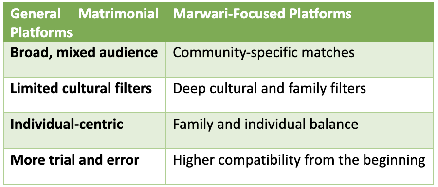 The moment you step onto a Matrimonial Platform for the Marwari Community, the experience feels different. Profiles feel more relevant, conversations flow more naturally, and families feel more confident engaging. In fact, here’s a quick table of how it compares.